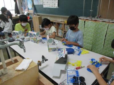 モーターの回る向きを逆にするためには、どうすればいいのかについて考え、実験しています。