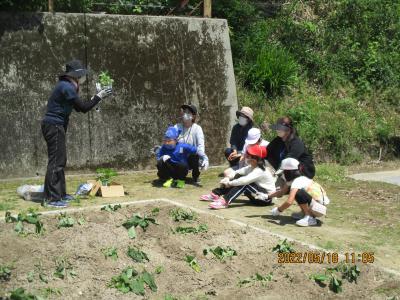 サツマイモの苗を、一つ一つ丁寧に植えていました。