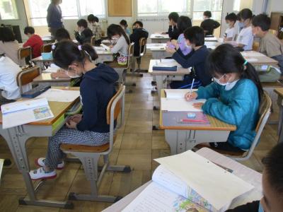 国語、算数、理科の3つの教科の調査問題に真剣に取り組む6年生。